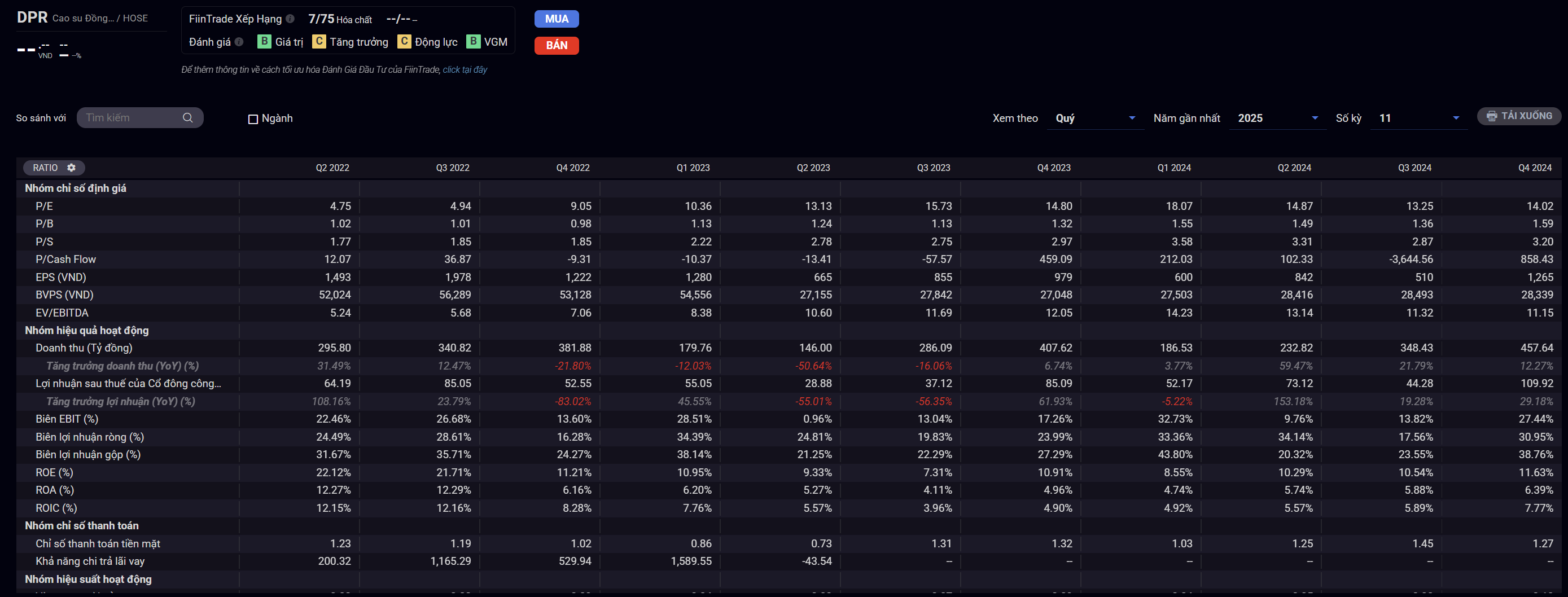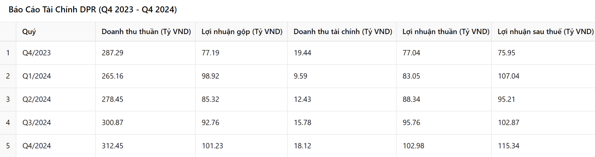 Doanh thu tài chính giảm nhẹ nhưng vẫn ổn định: Năm 2023, DPR ghi nhận 19.44 tỷ VND doanh thu tài chính, trong khi năm 2024 con số này dao động từ 9.59 - 18.12 tỷ VND.