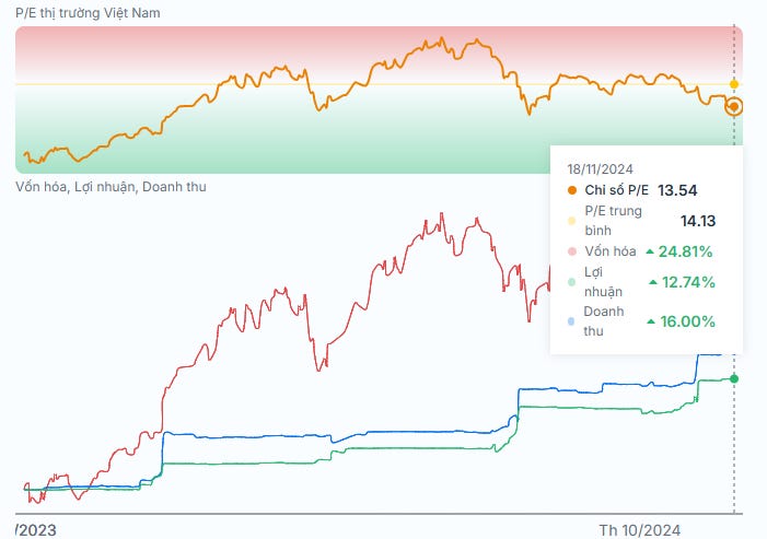 Doanh nghiệp đang hoạt động tốt và tạo ra lợi nhuận tăng trưởng, khiến chỉ số EPS tăng và P/E giảm.